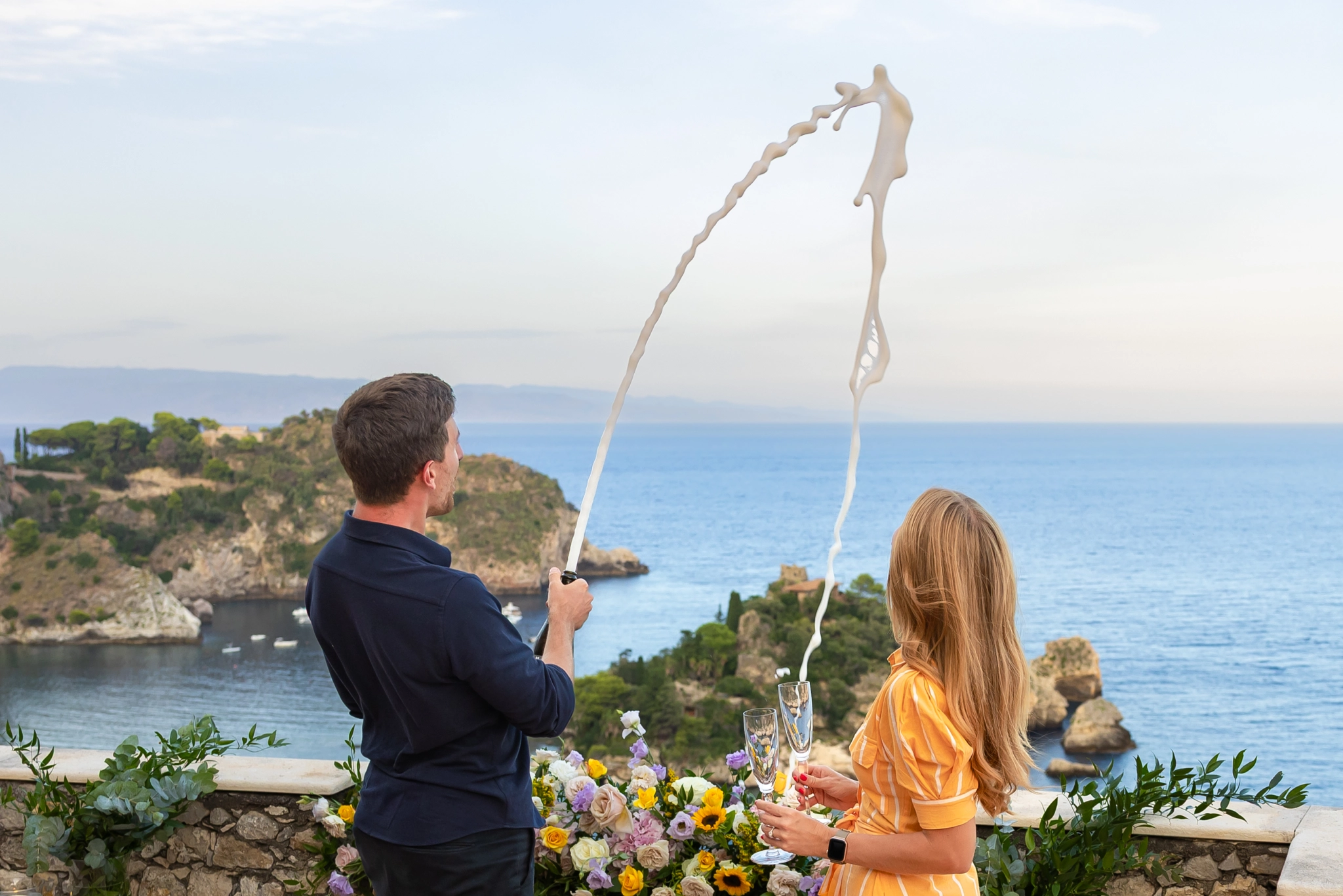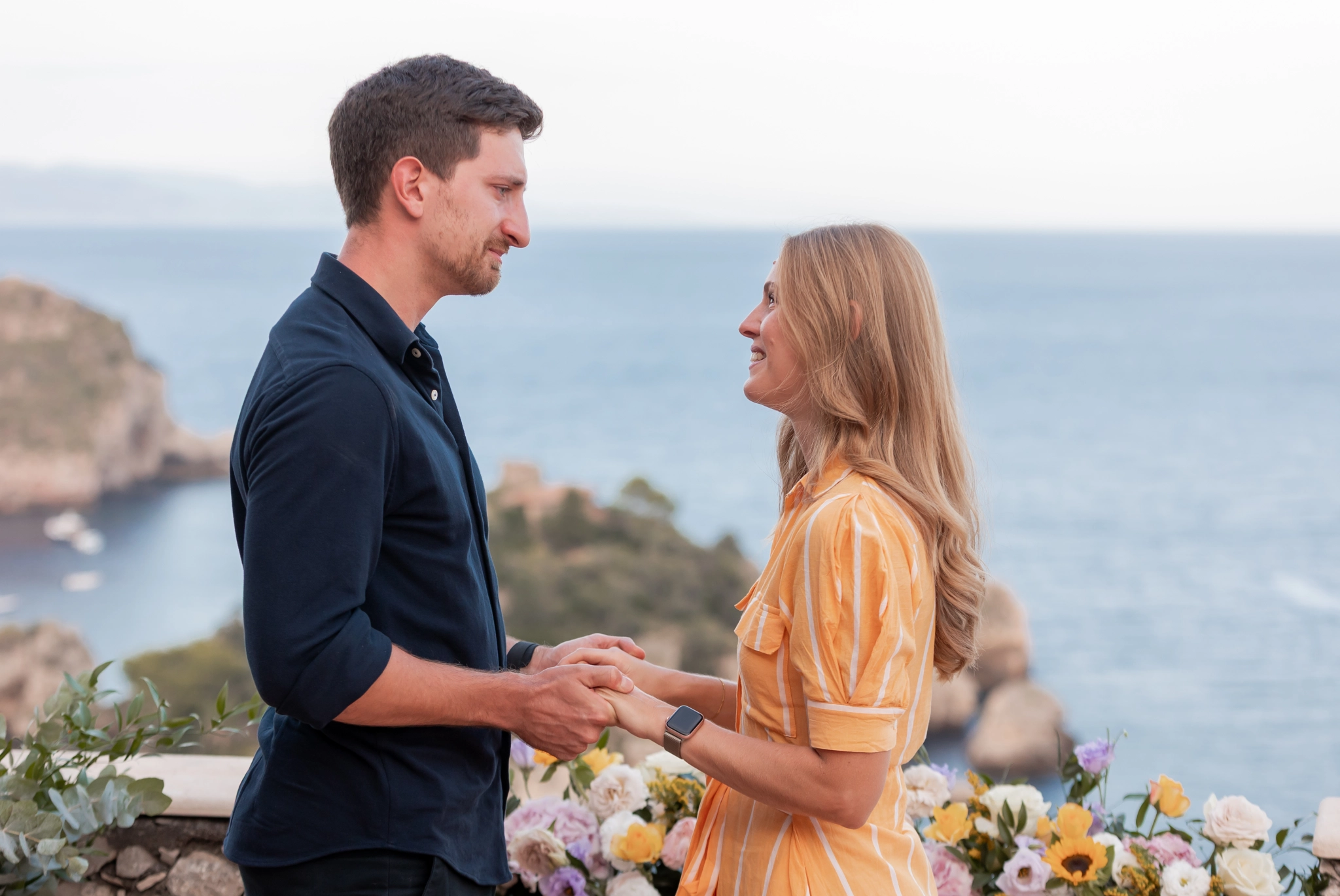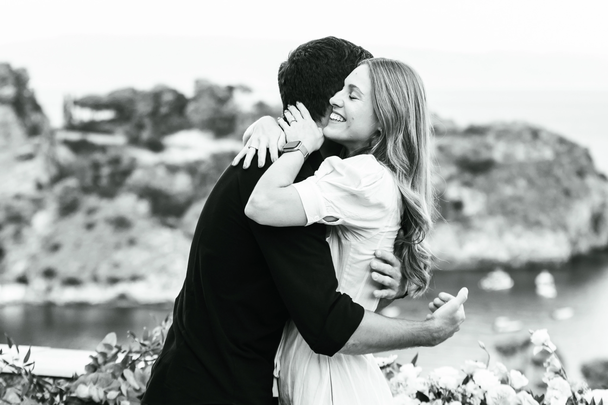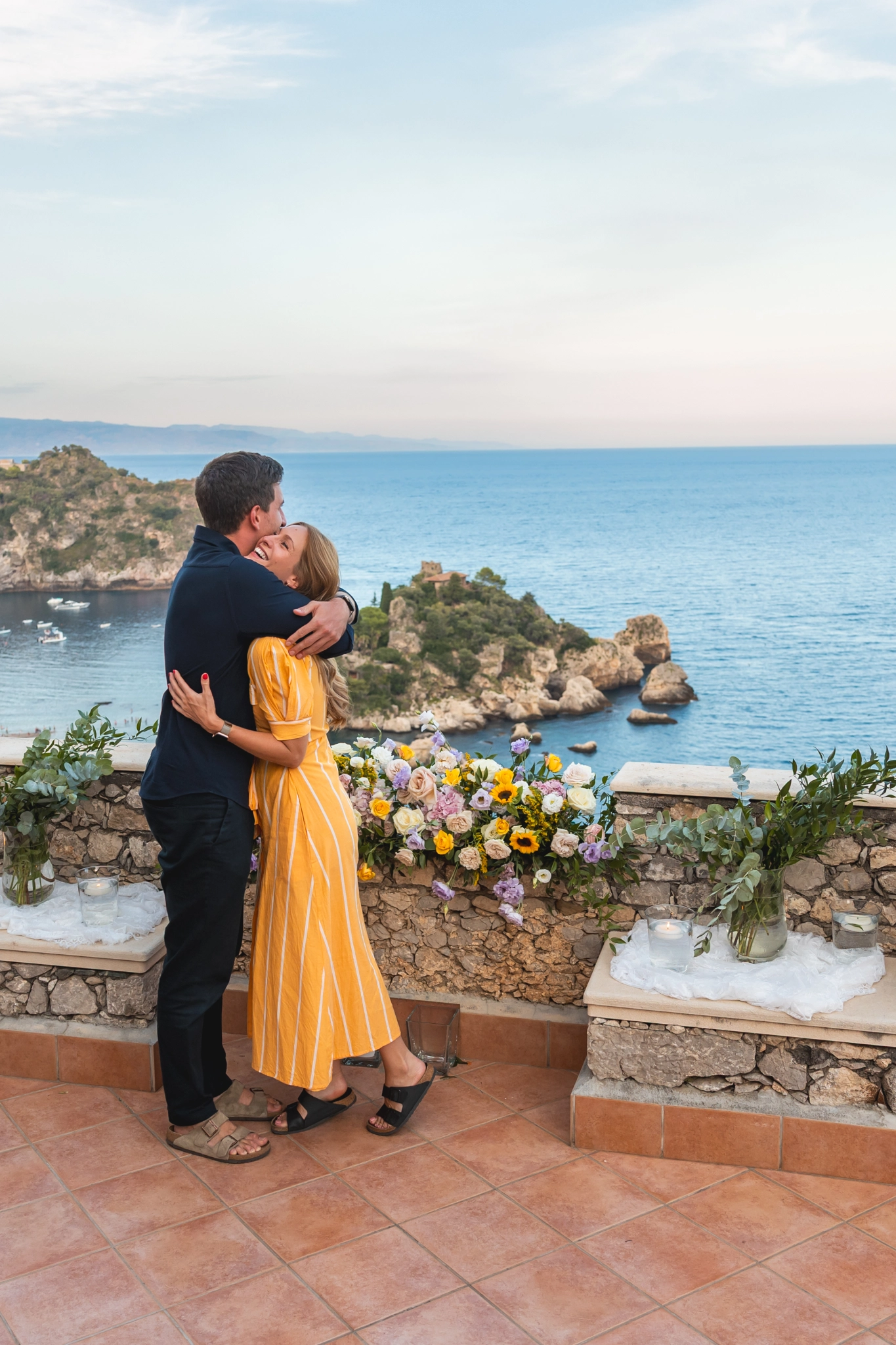 To keep the secret, Stefano told Océane he had arranged a photoshoot in Taormina as a gift. A beautiful idea on its own: photographs to capture their love in one of Italy’s most iconic settings. But the camera was also witness to something deeper. That photoshoot was about to become the frame of a life-changing question.
