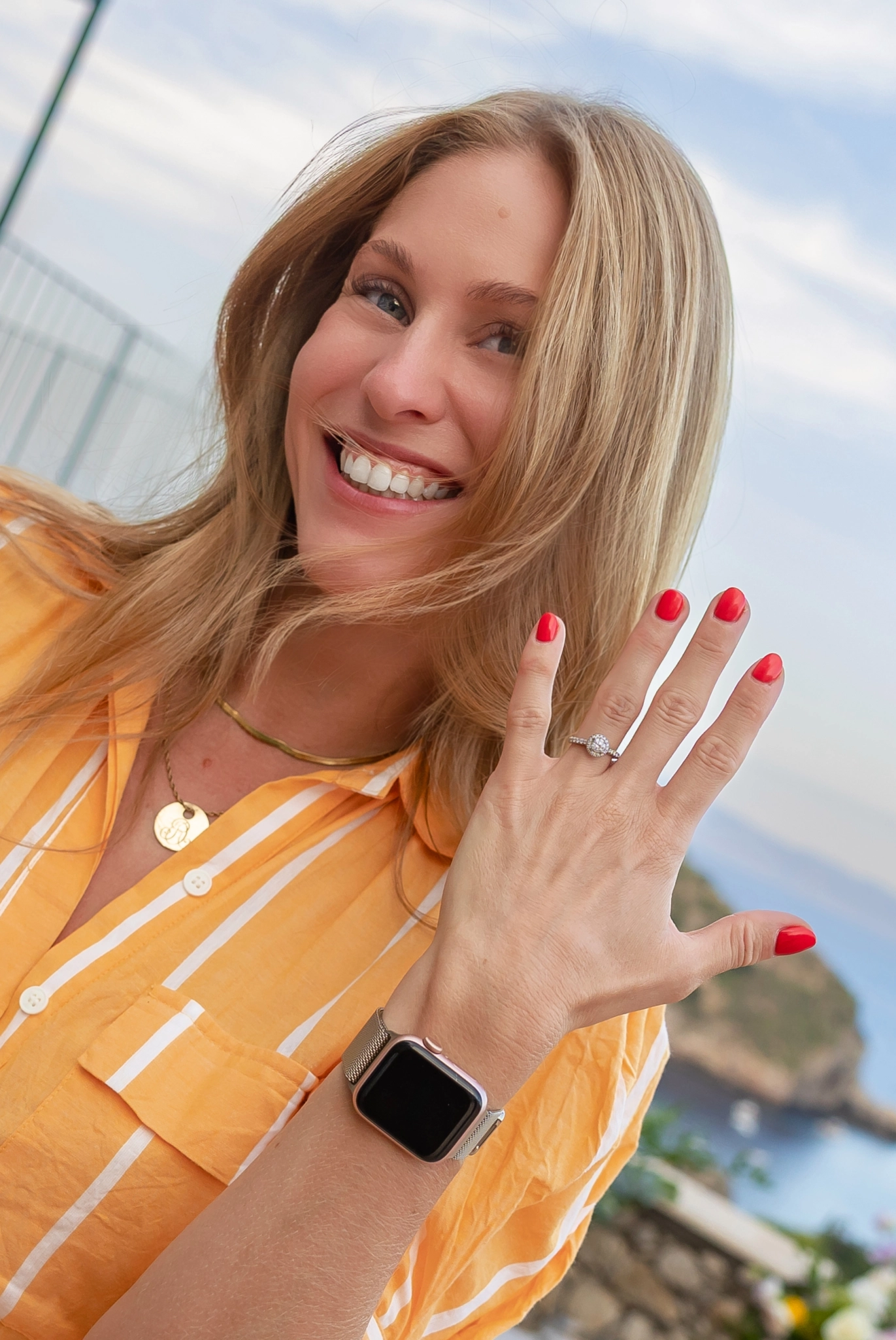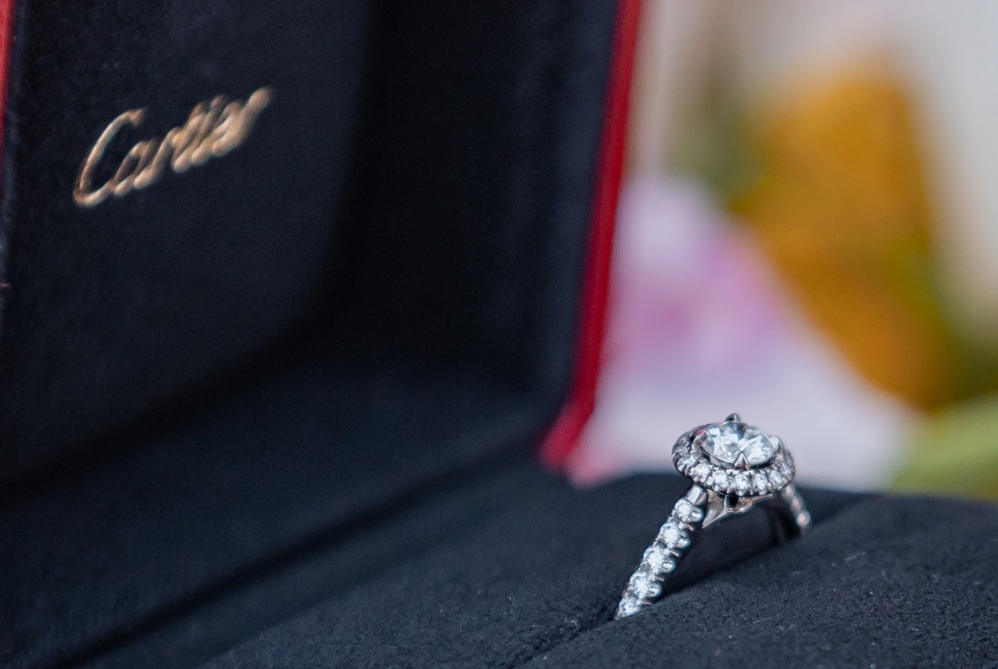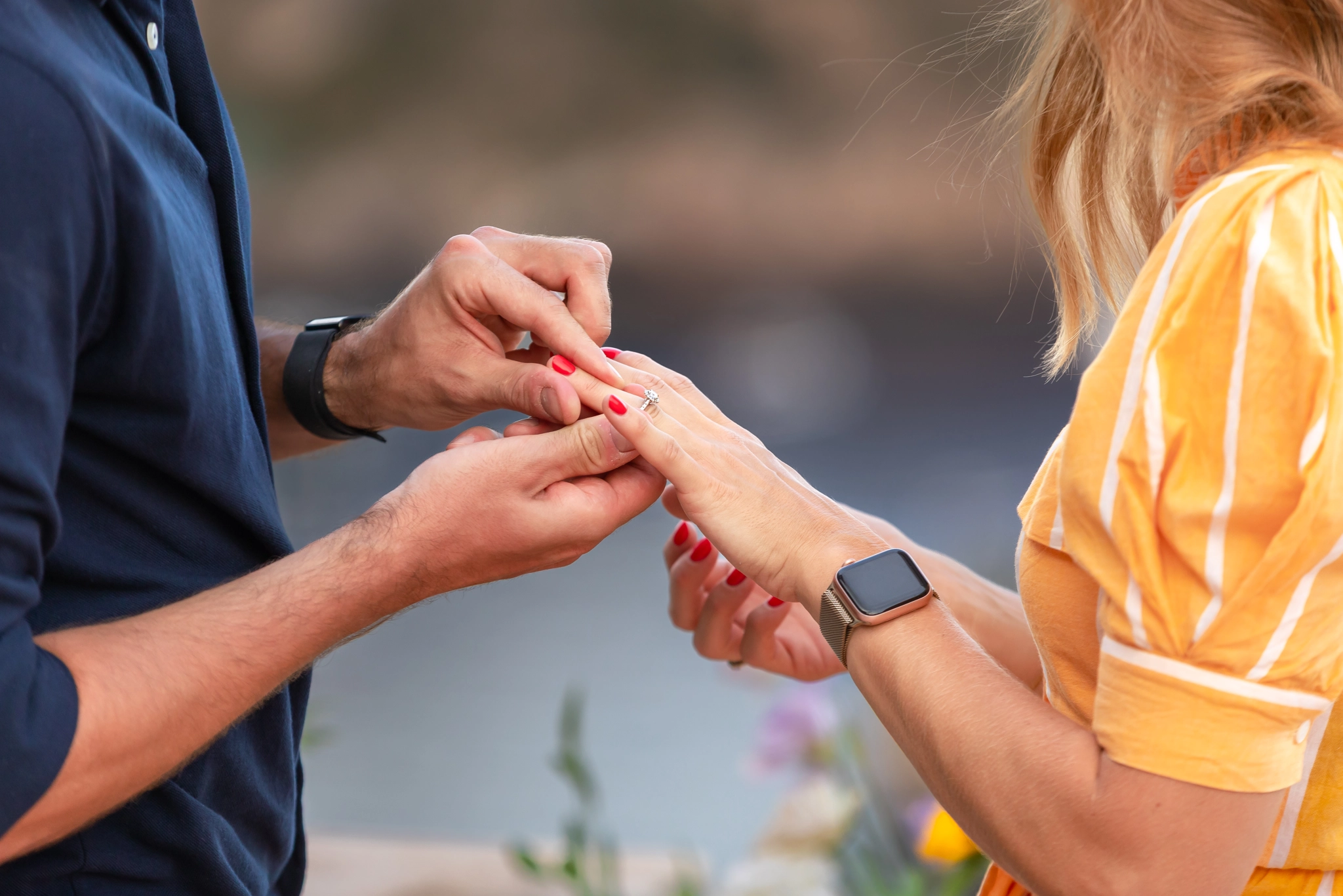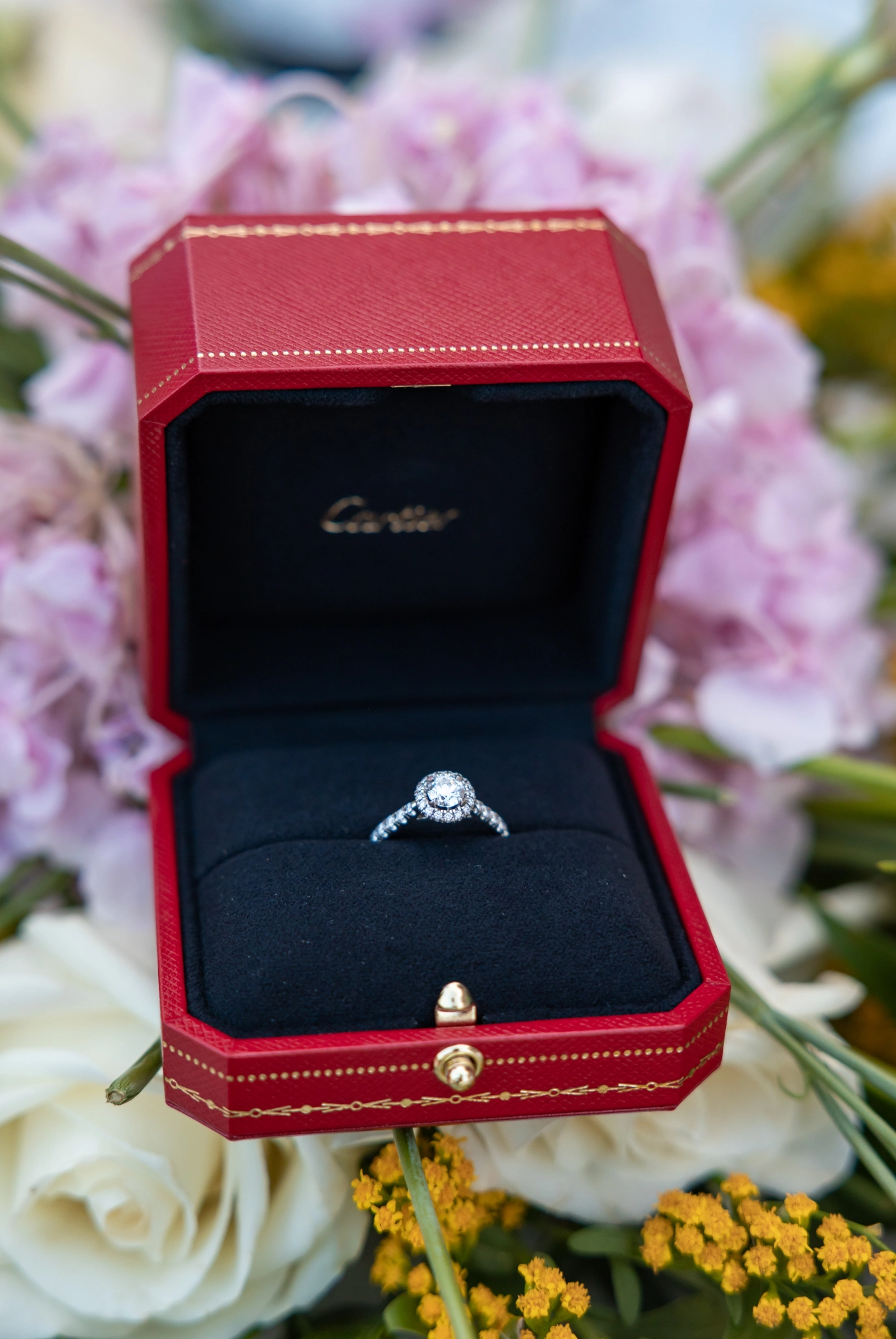 In the middle of the session, while the light softened into pastel shades across the coastline, Stefano knelt down. From his pocket, he brought out the iconic red box. Inside: the elegant Cartier Destinée ring, a symbol of eternal love. More powerful than any photograph, his words transformed a simple session into a story they would carry forever.