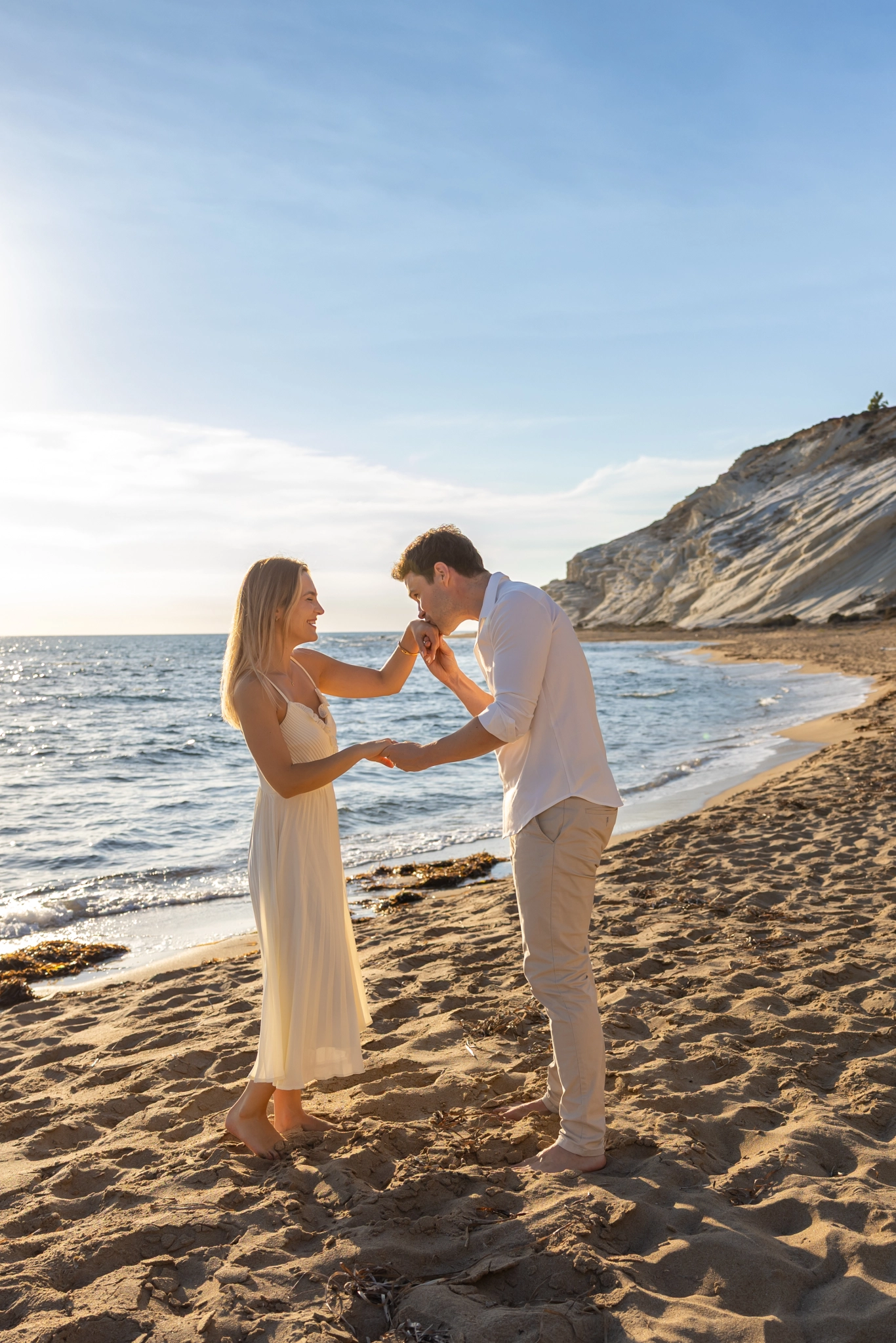 Unlike more crowded Mediterranean spots, here you can still find corners of peace where time seems to slow down. A surprise proposal on the beach in Sicily is not only about the “yes”, but also about the journey to reach that moment: the walk along the sand, the salty air, the golden light of sunset, the feeling of being in a place where nature is still untouched.