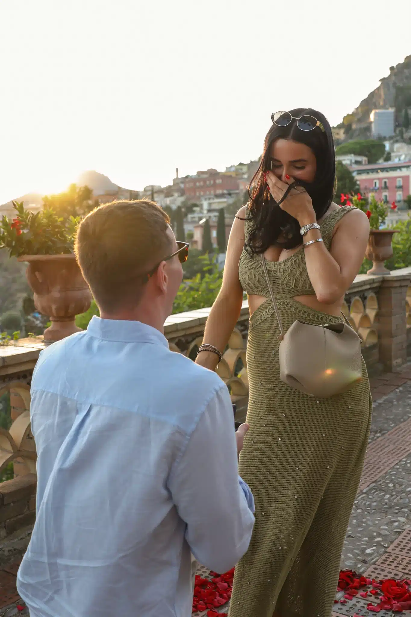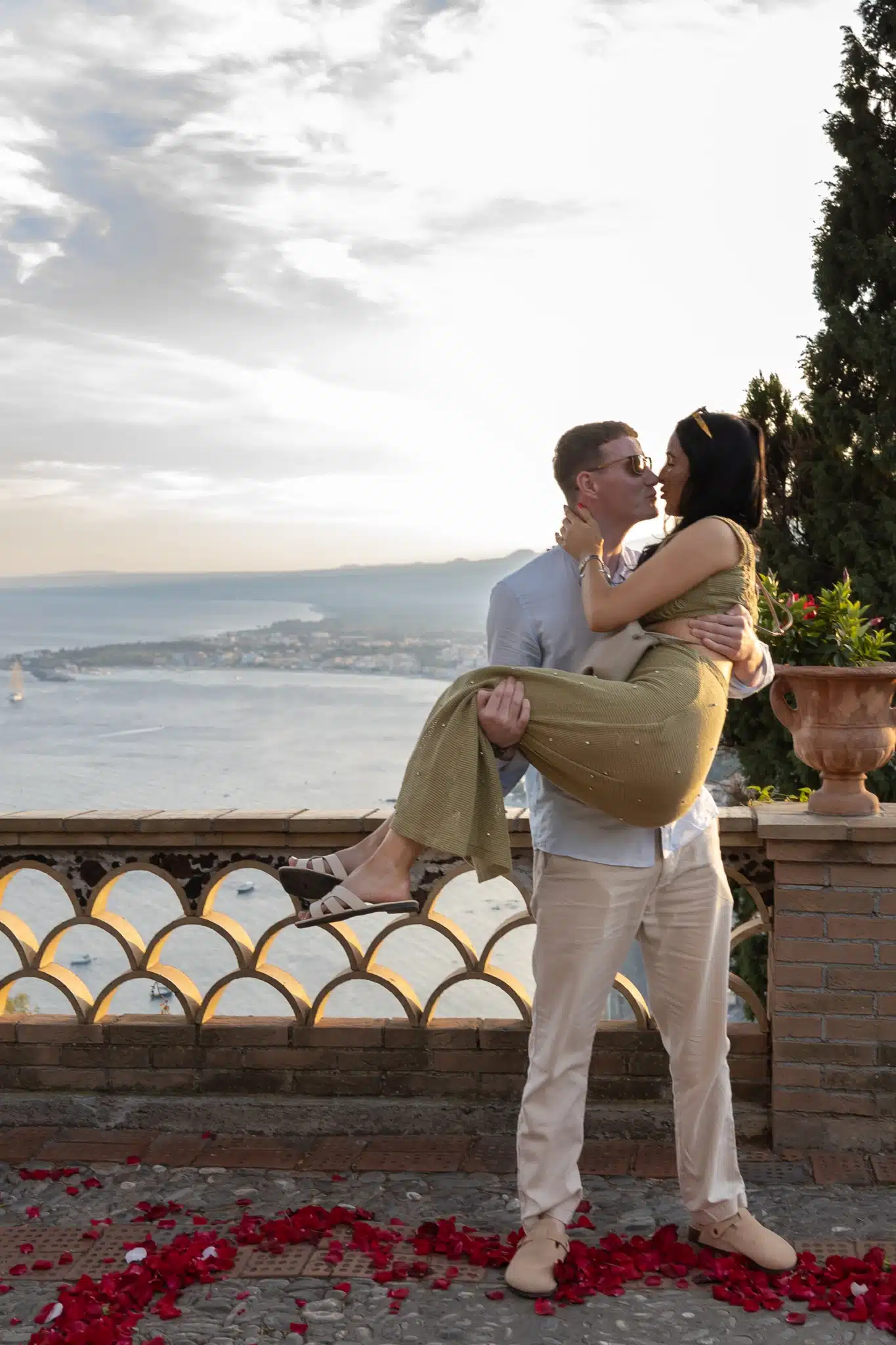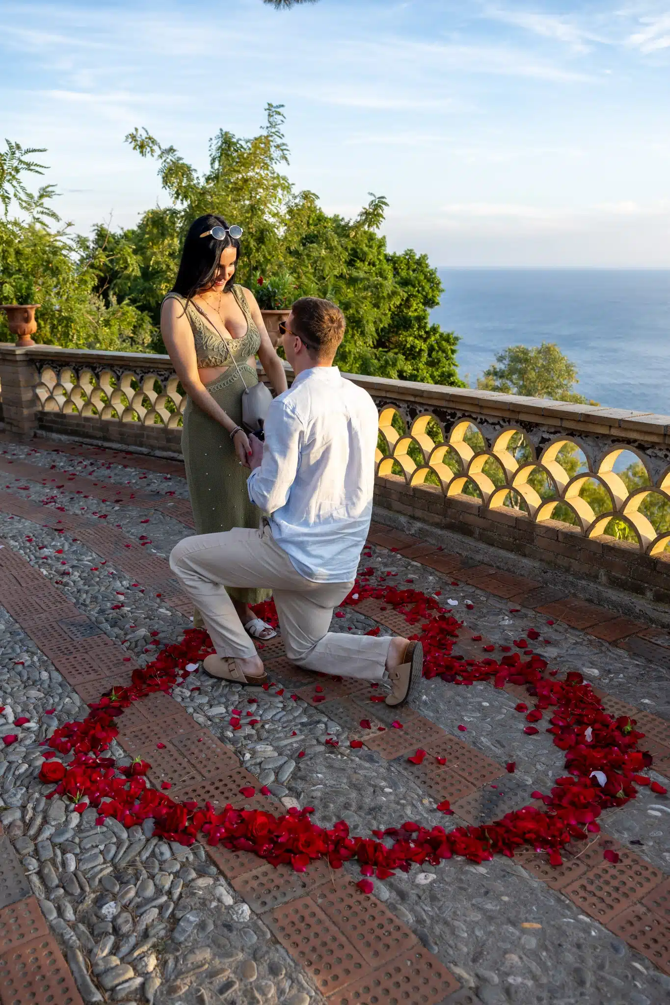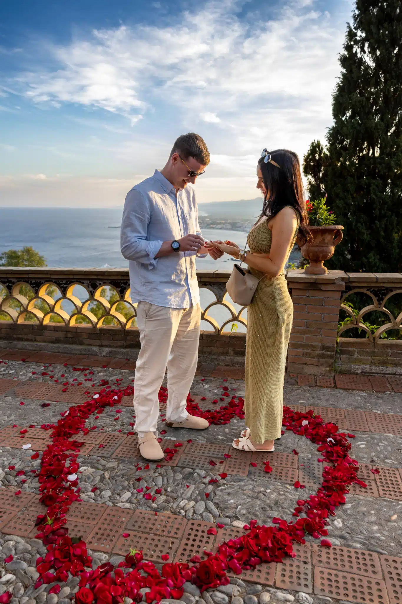 The scene was pure magic: the sea behind them, the petals beneath their feet, the silence of the garden broken only by her gasp. She said “yes,” and the belvedere confirmed once again why it is the best place proposal Taormina.