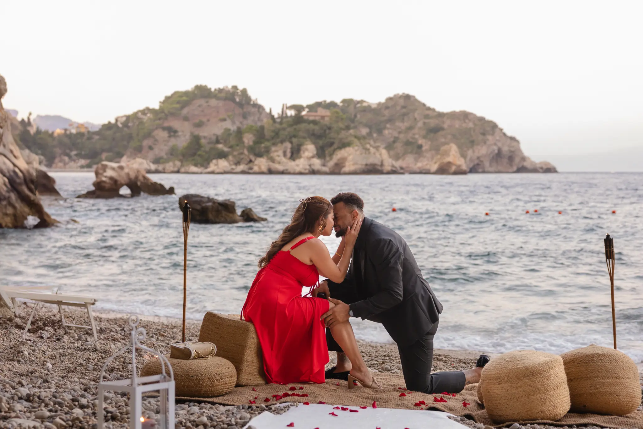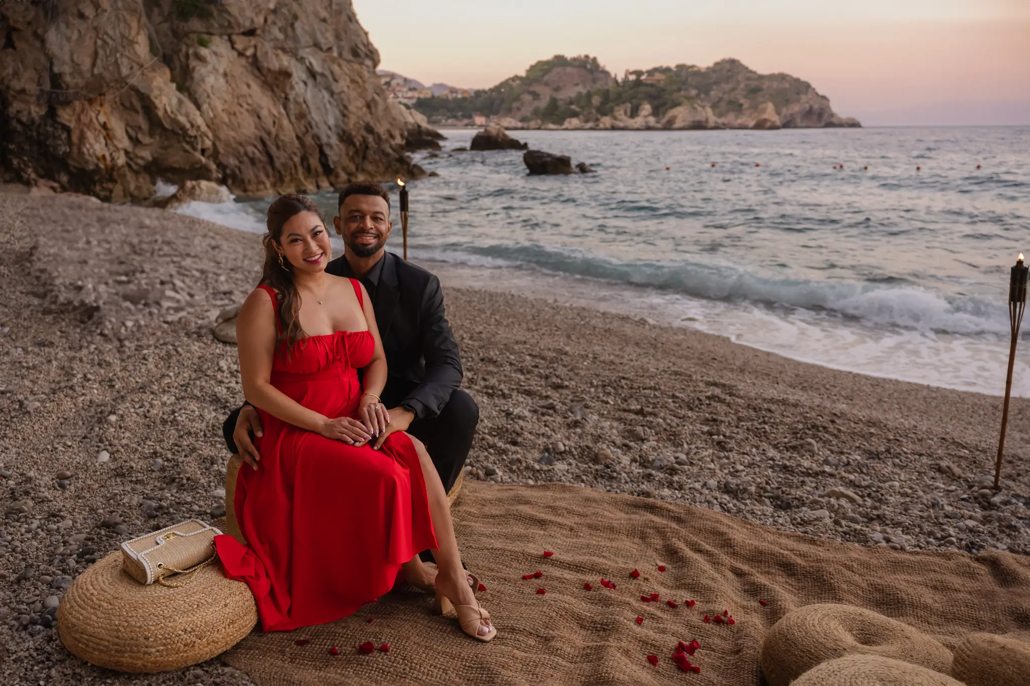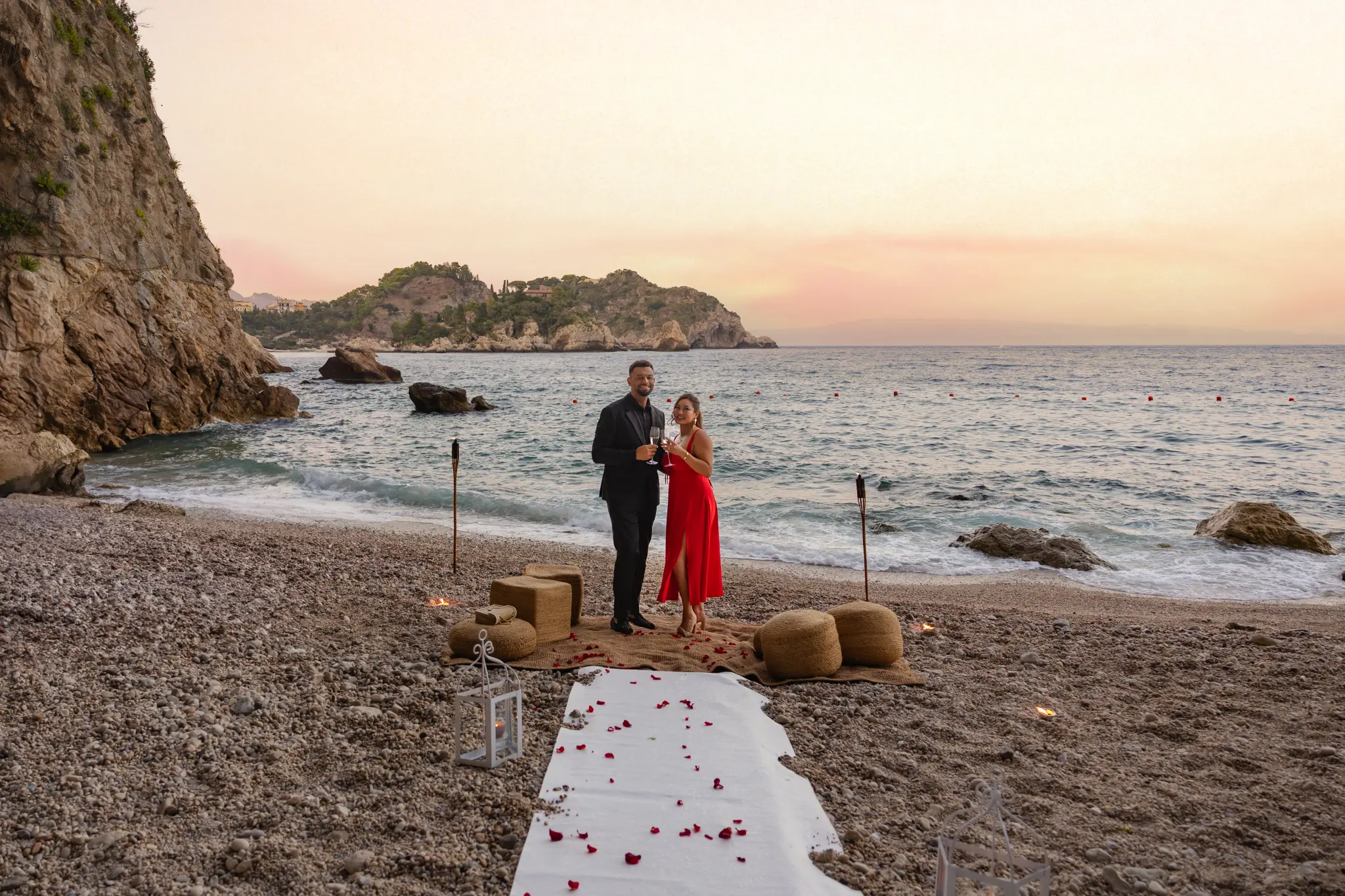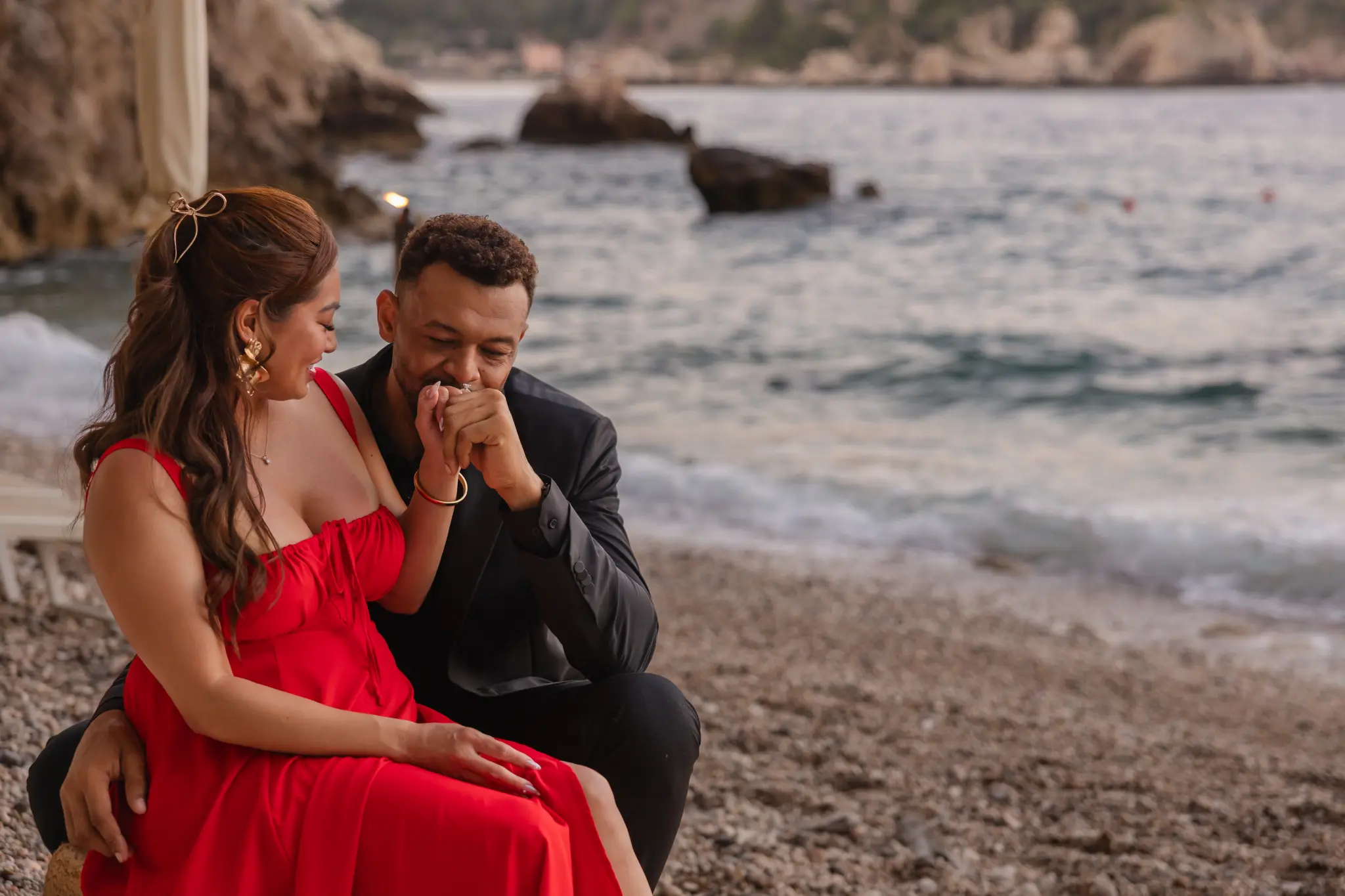Coppia alla spiaggia privata di Capotaormina a Taormina durante proposta di matrimonio