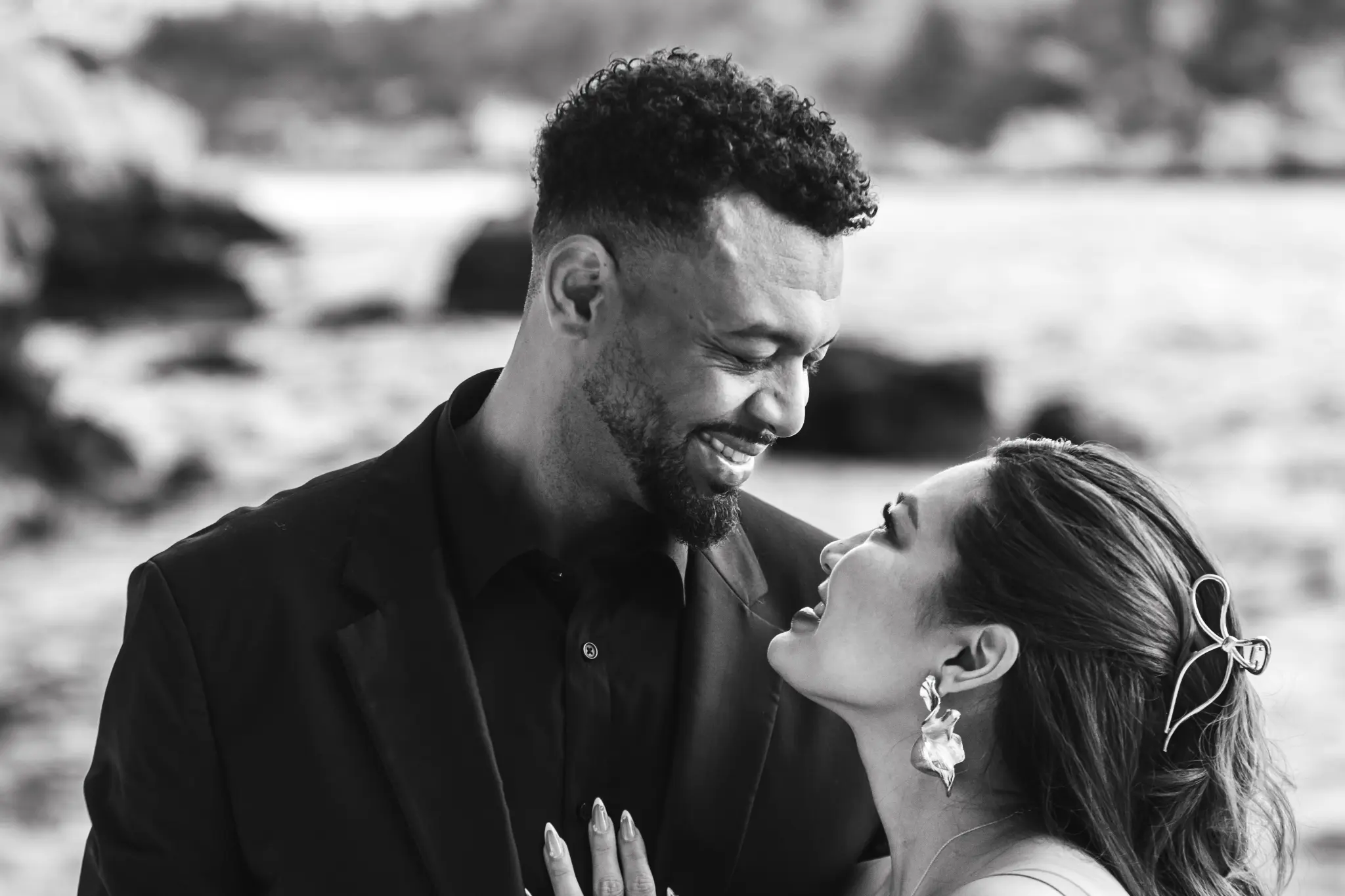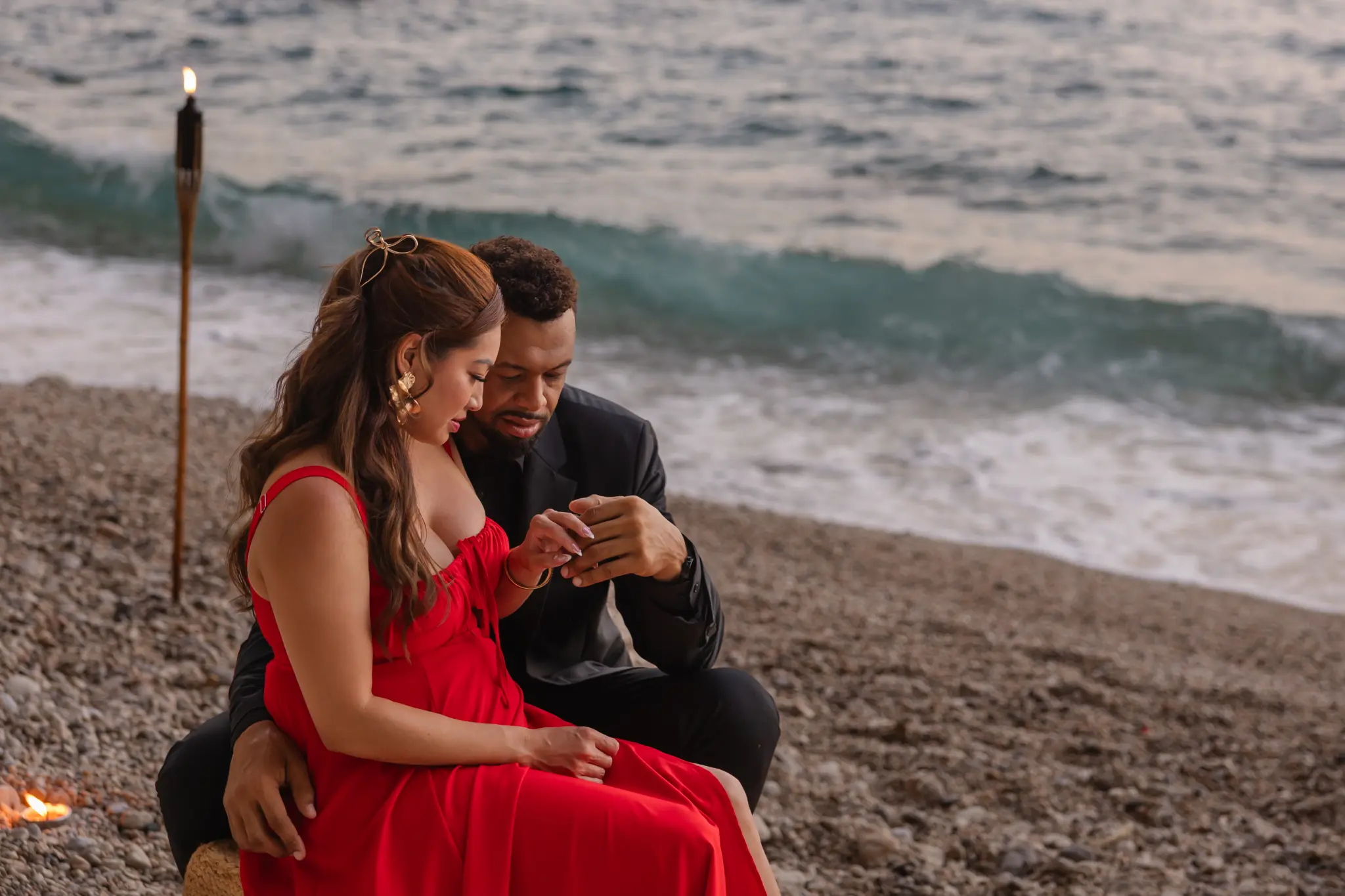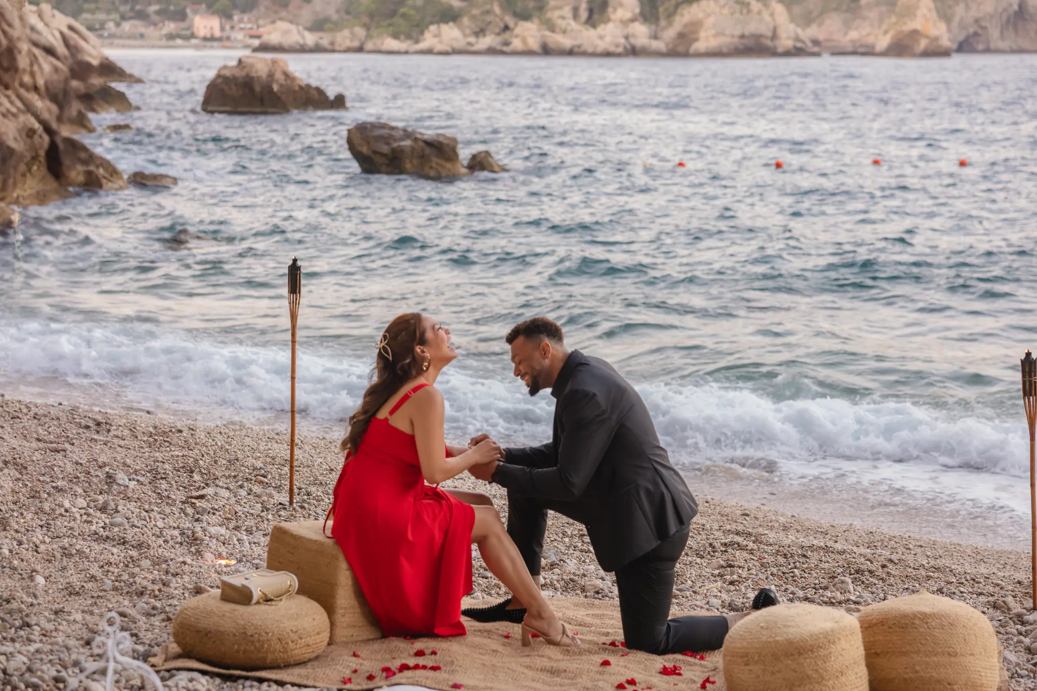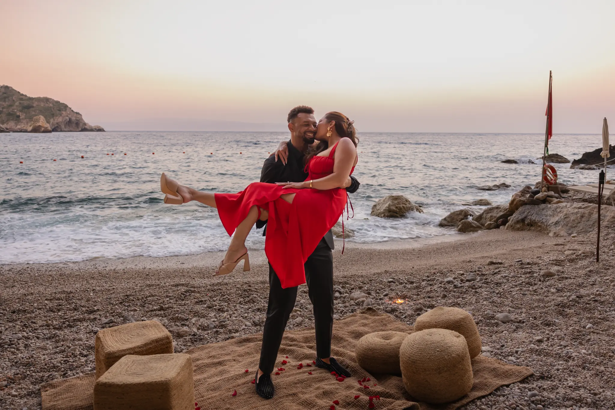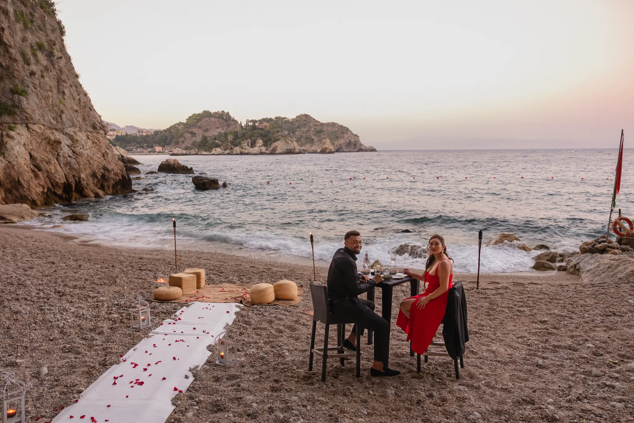 Coppia alla spiaggia privata di Capotaormina a Taormina durante proposta di matrimonio