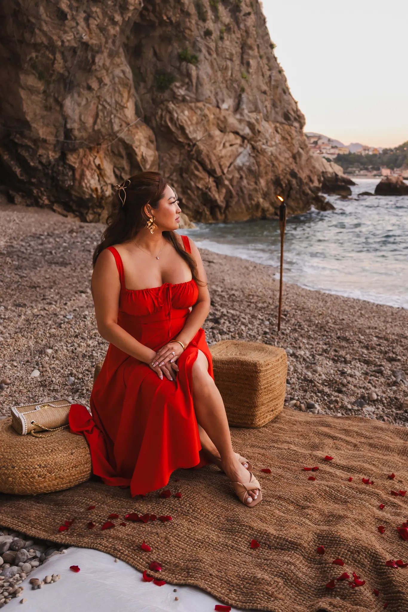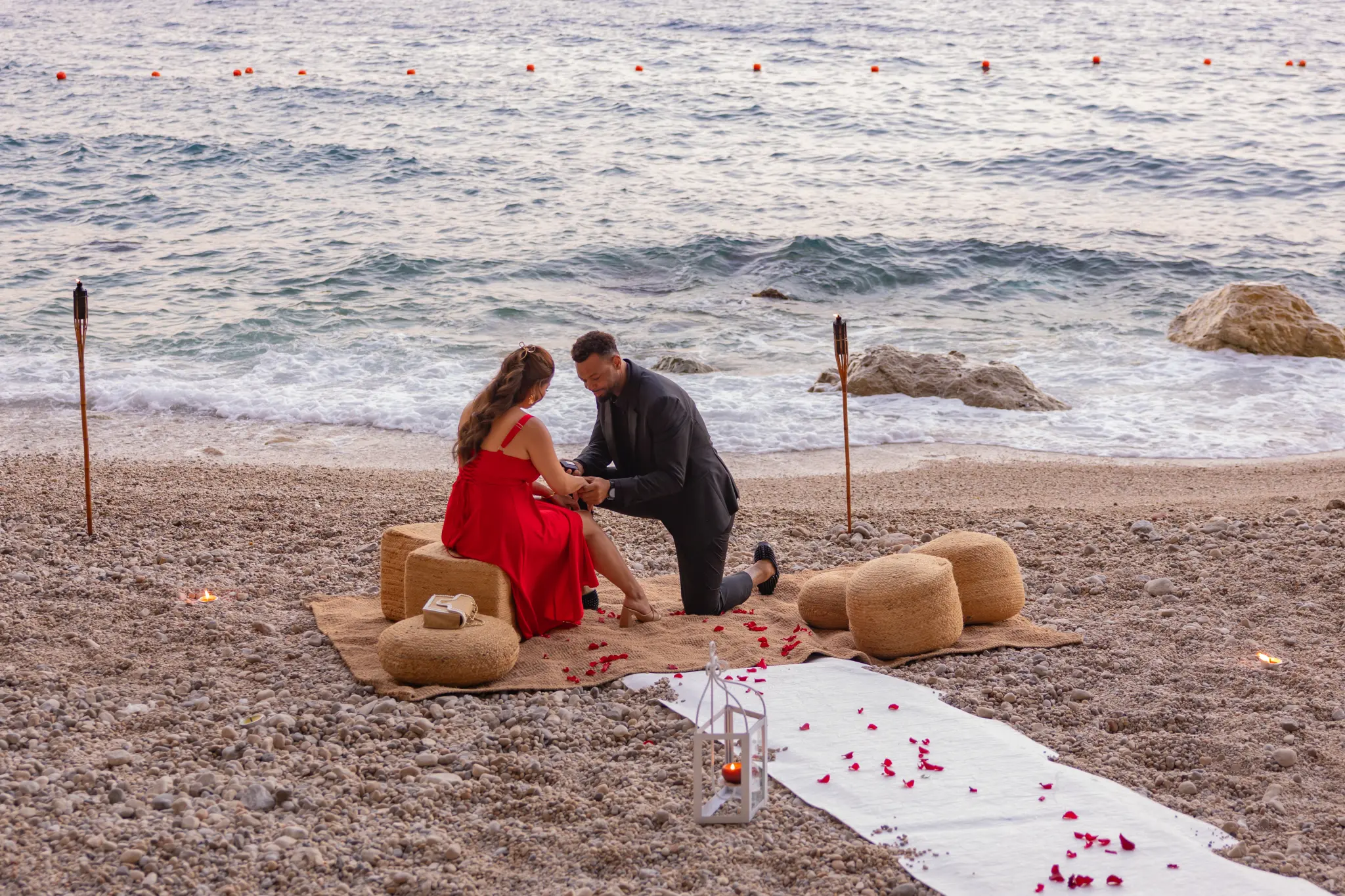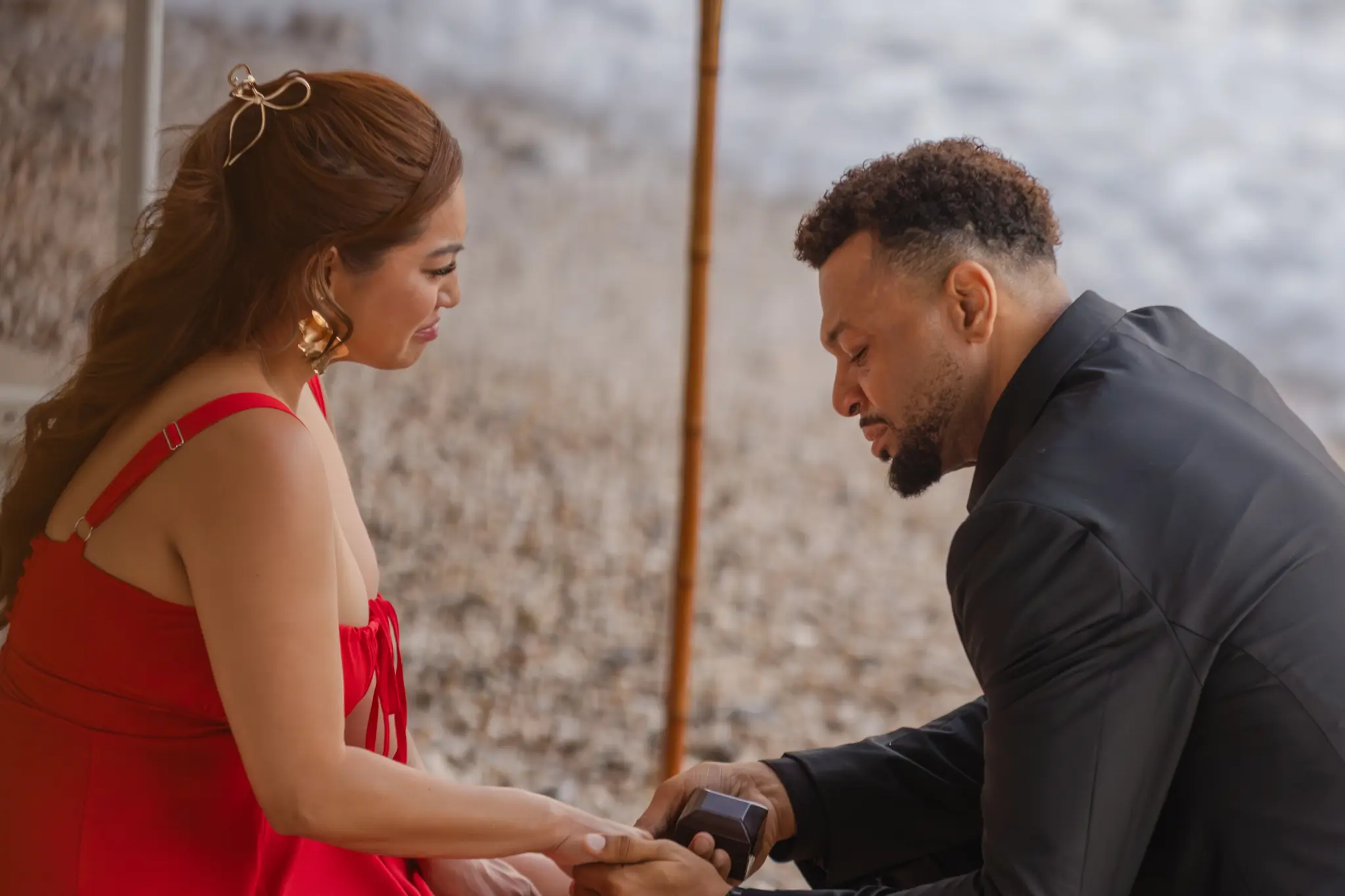 E poi, il gesto più semplice e più difficile del mondo: inginocchiarsi, guardarla negli occhi e aspettare la risposta. Niente folla, niente rumore. Solo il mare, il vento leggero e la promessa di un futuro da scrivere insieme.