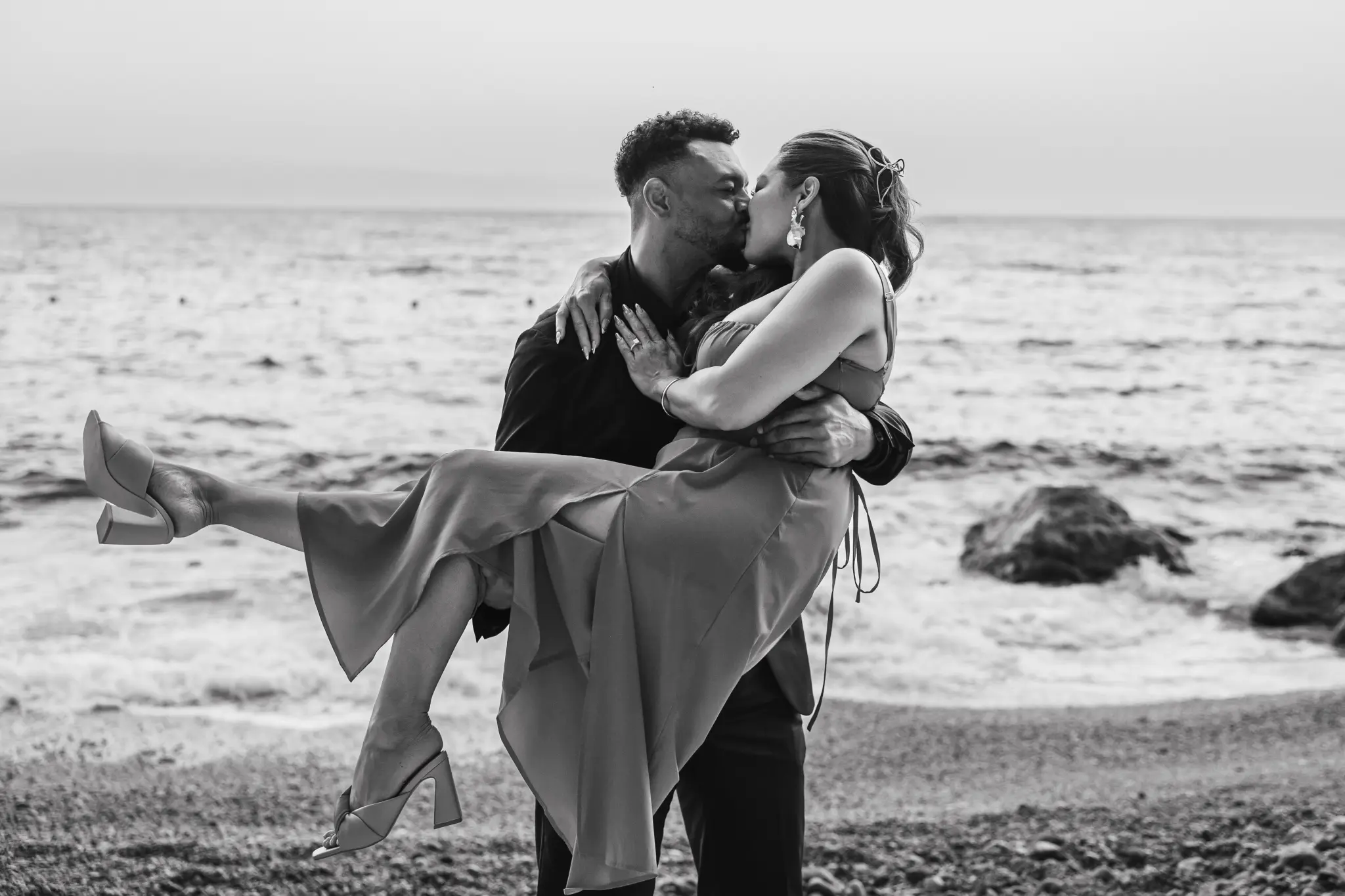 Bacio sulla spiaggia di Capotaormina durante proposta di matrimonio