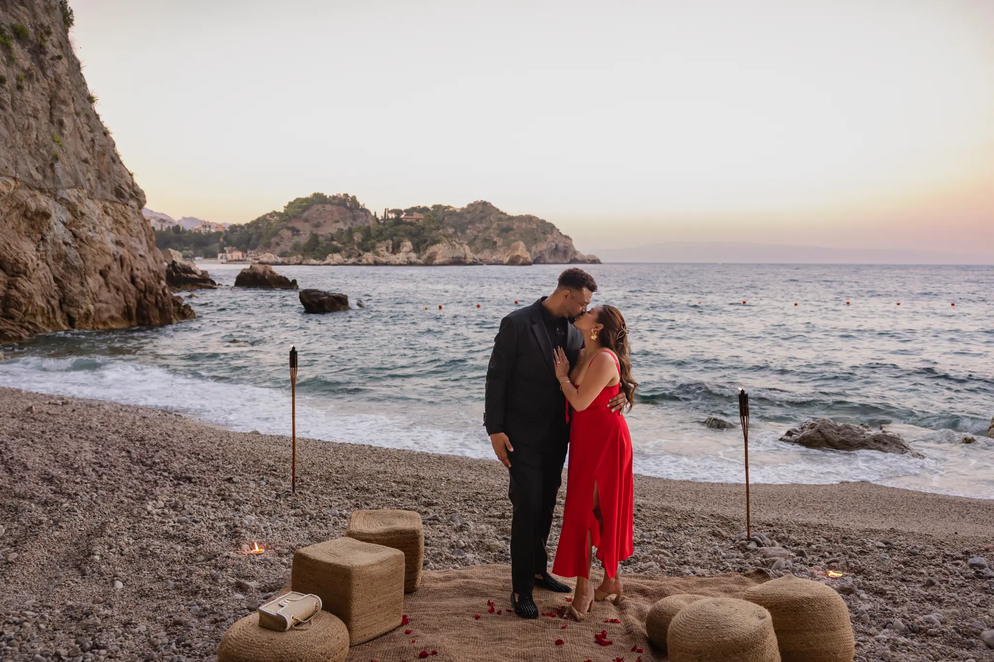 Bacio dopo la proposta sulla spiaggia privata di Capotaormina