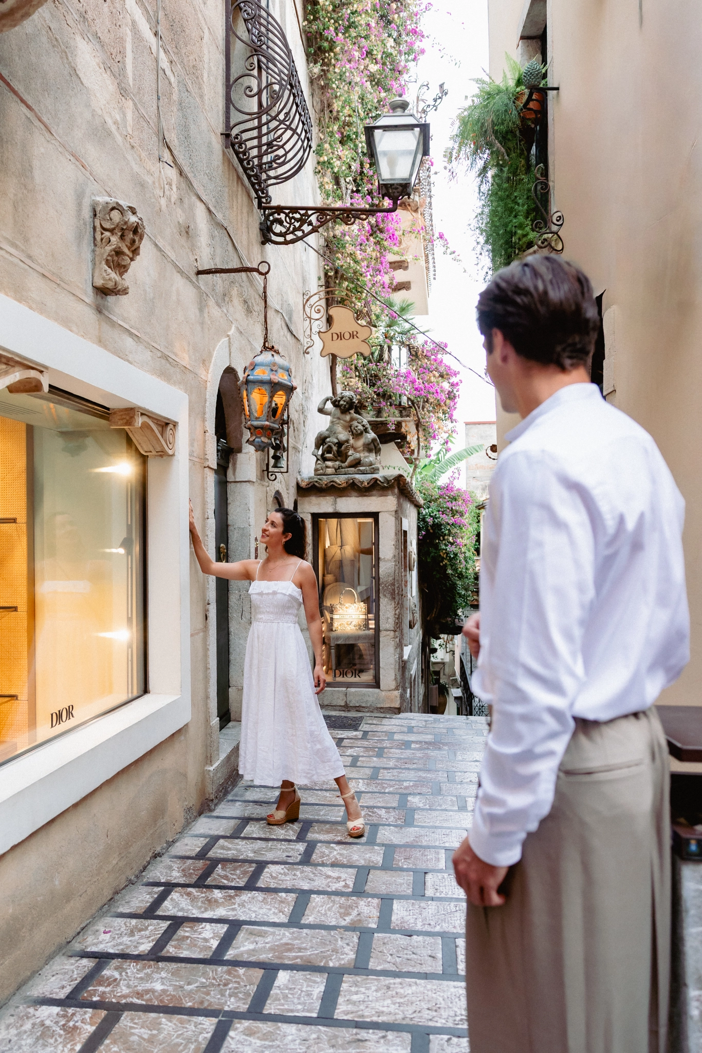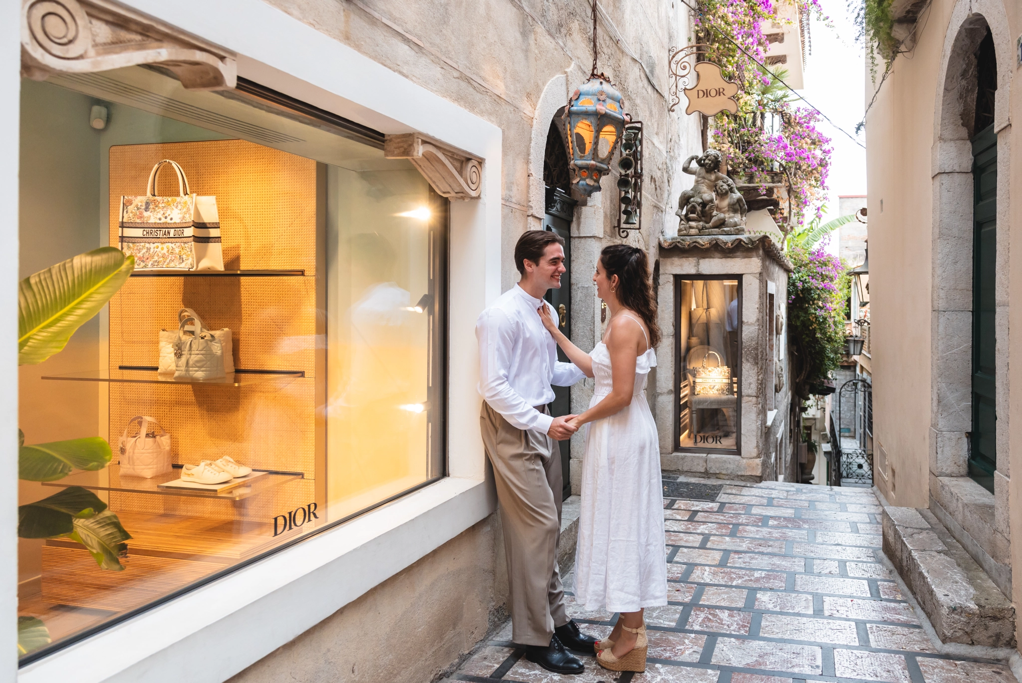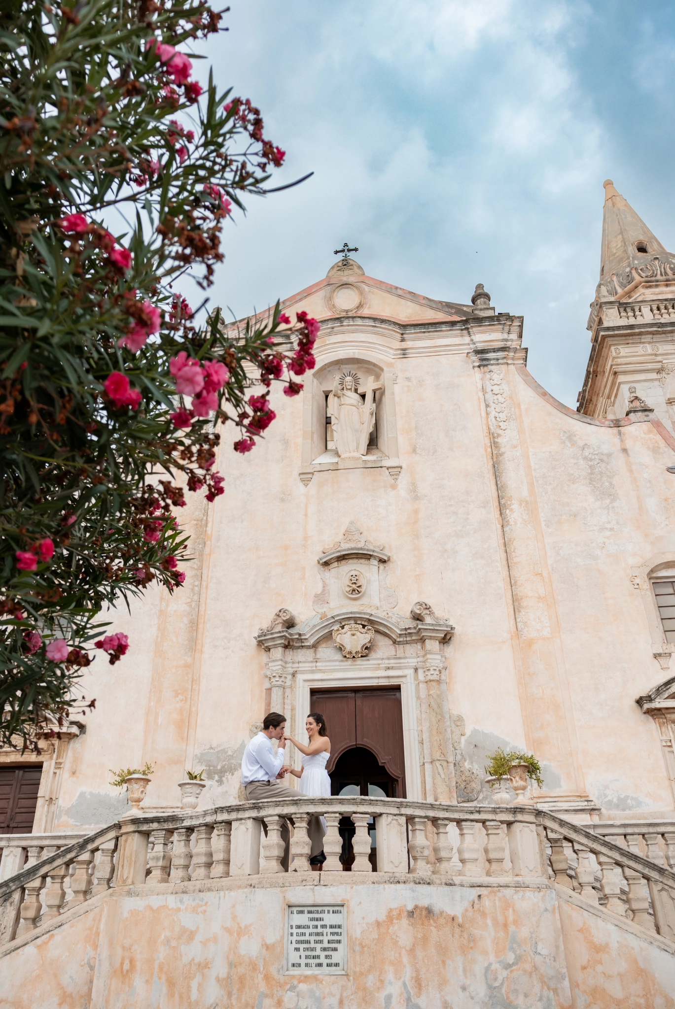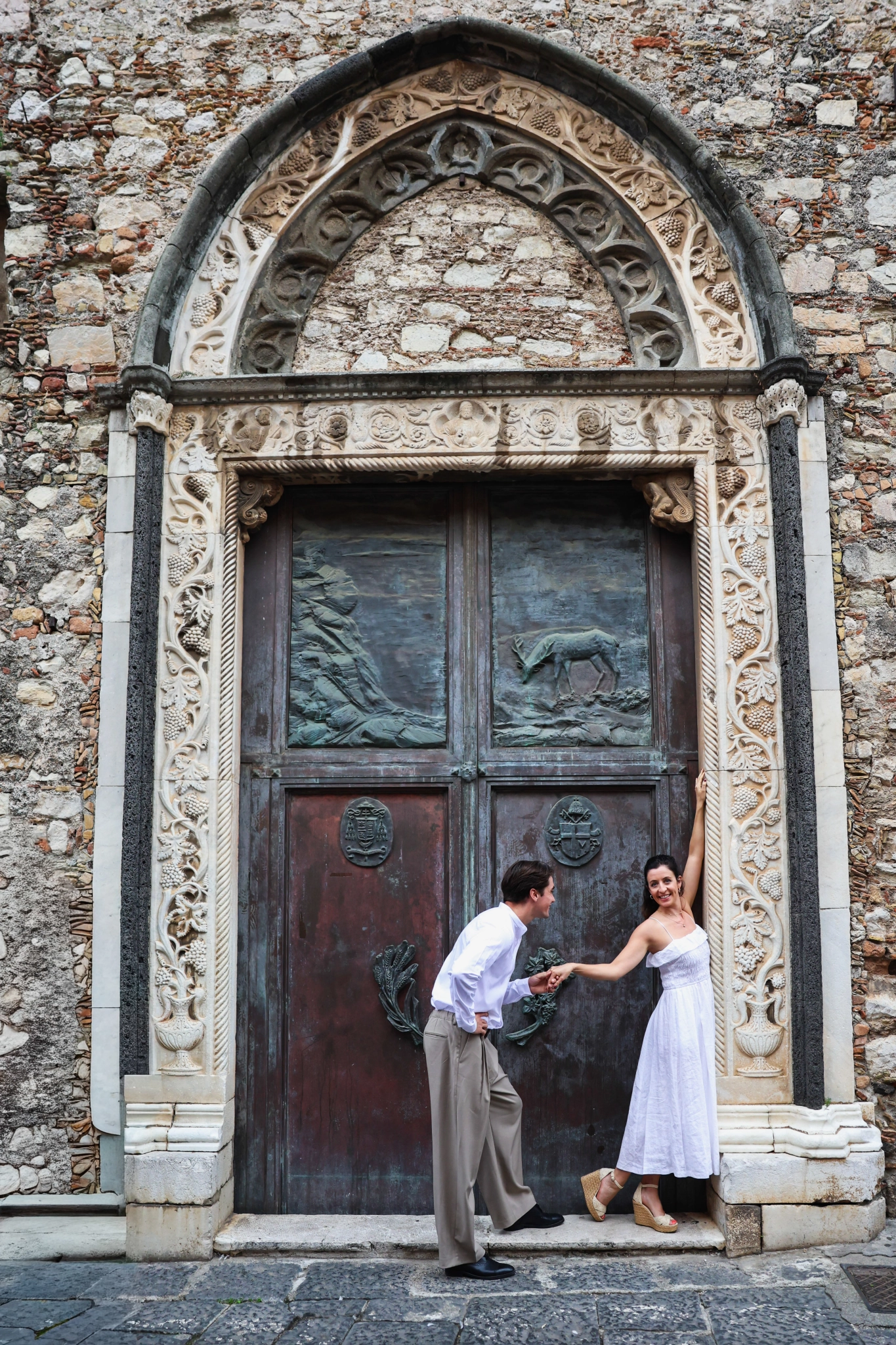 E io, come fotografo a Taormina, insieme a mio marito, creatori di Foto Event Studio, li abbiamo seguiti passo dopo passo per raccontare la loro storia: una passeggiata tra vicoli fioriti, sorrisi sinceri e quella luce che solo l’isola sa regalare.